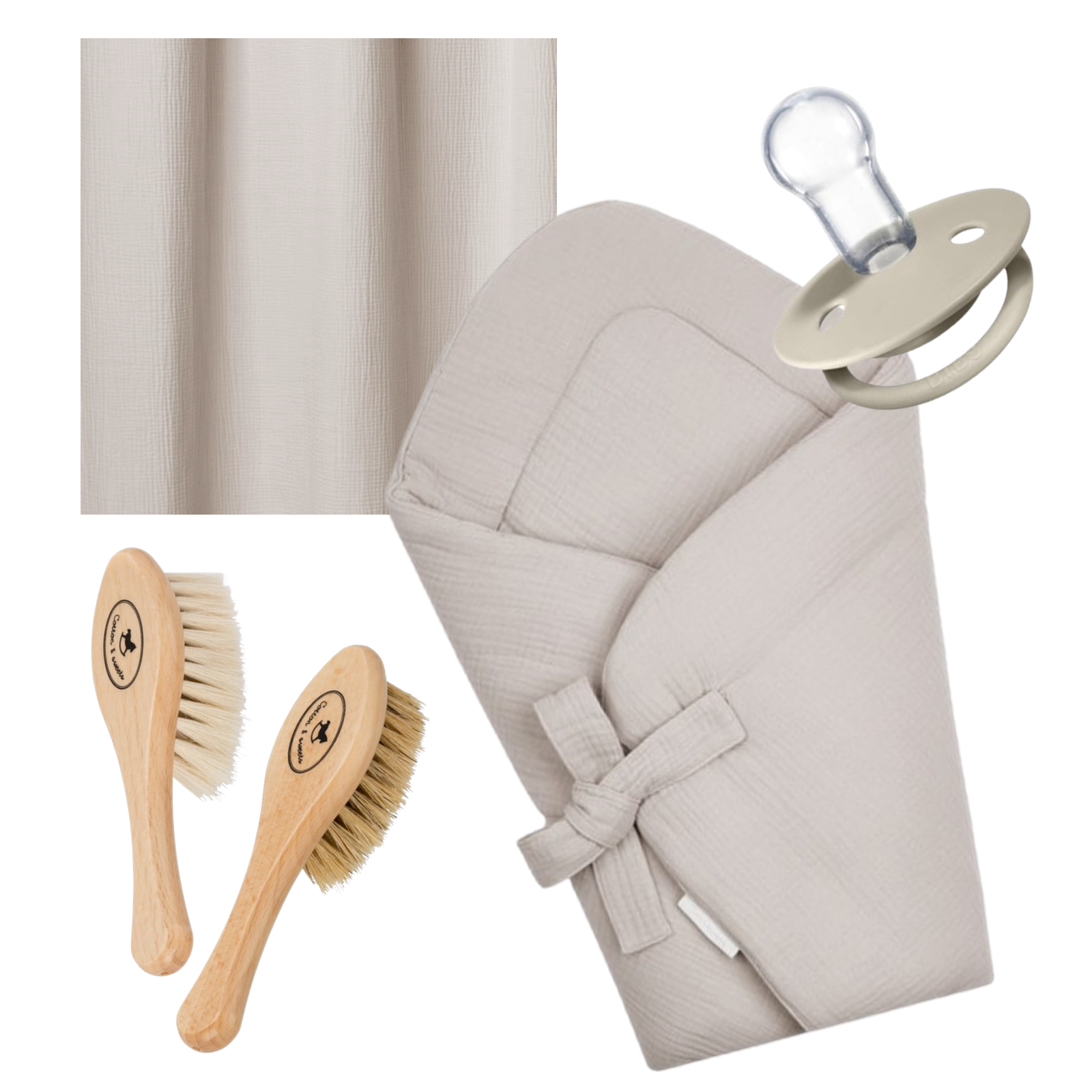 The Beige baby set is a perfect option for people looking for a gift for future parents. The set of five products will be useful after the baby is born.